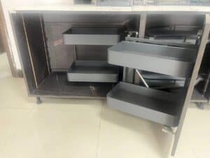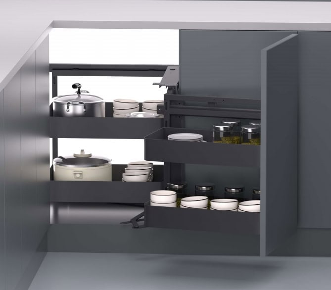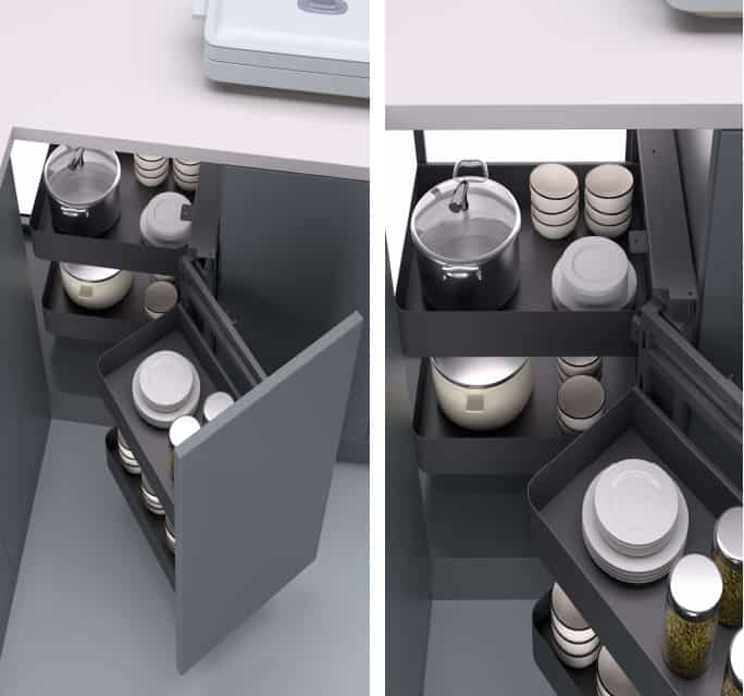 ■ The corner spaces where two perpendicular cabinets meet are often underused. These units convert such spaces into efficient, easy-to-reach storage. To make the most of available space, this top-of-the-line sliding cabinet unit has all-steel undermount slides for quiet, smooth operation.